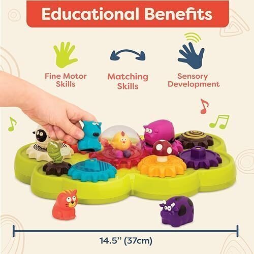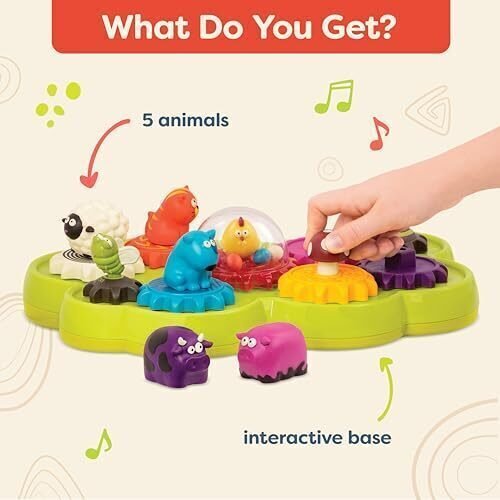 Musical Shape Sorter: Play all day with an interactive shape sorter that features friendly animals, 5 fun songs, and colorful lights. (3 AA batteries are included.) Sort & Match: Kids can match the shapes and colors of the gears to their corresponding animals to play. Fun Features: Turn the mushroom knob to see the animals swirl and sing, press the fly to switch songs, or push on the light-up chicken coop! Educational Toy: This interactive toy develops fine motor skills, promotes matching skills, and improves sensory development. Age: This shape sorter is recommended for toddlers 18 months +