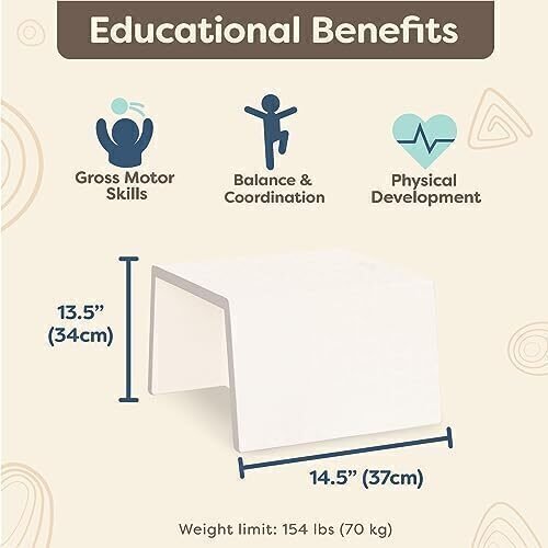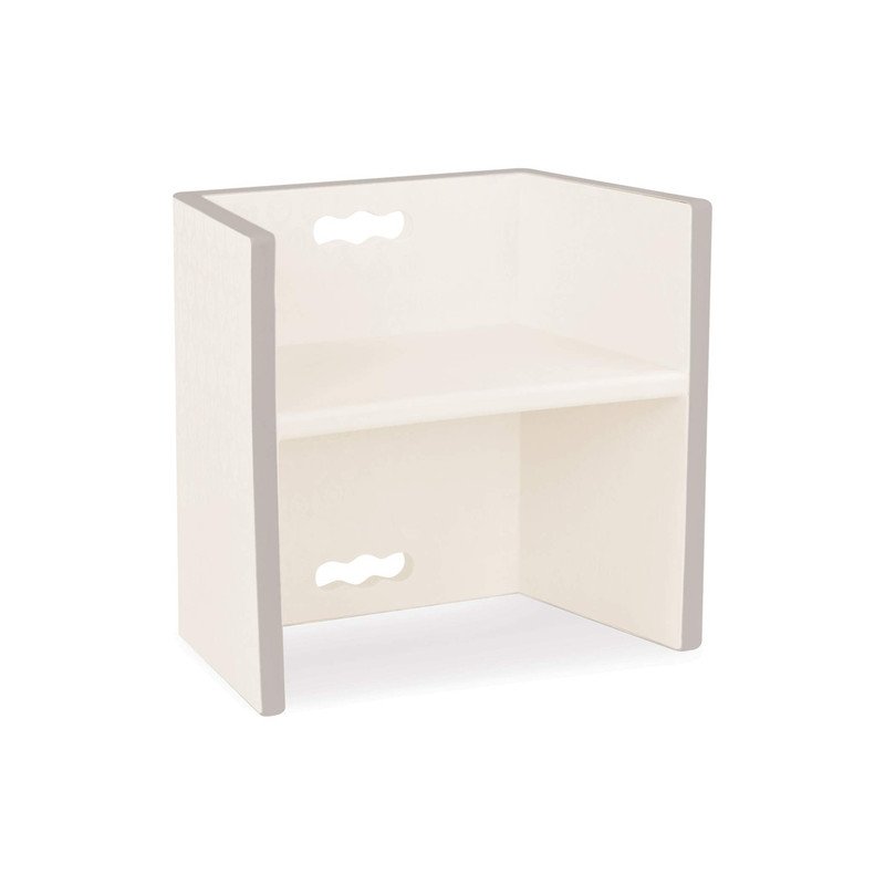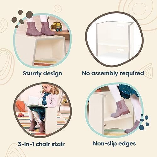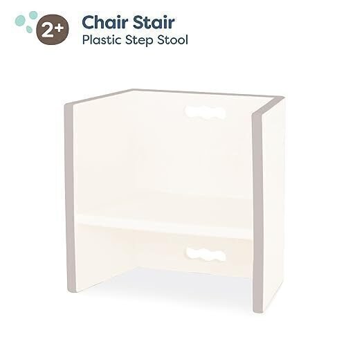 The sleek, stylish, and multifunctional Chair Stair works as a seat, step or stair! Sized perfectly for toddlers or kids a little older, this ivory-colored chair lets your child sit comfortably or reach new heights with confidence. This piece of kids furniture is stable in any configuration and there?s no need to assemble it. Just flip it to sit or step up! The edges are rubberized for extra safety and the handles on both sides make it easy to move this step stool from here to there. Go low, reach high, or flip it around to find the best seat or step for you! Not to mention, the Chair Stair also comes in a mint color and coordinates perfectly with all of the kids furniture from B. spaces. And because we at B. keep the environment in mind, parents will be happy to know that our packaging is 100% recyclable. Supports a maximum weight of 154 lbs (70 kg). Recommended for kids 2 years and older.