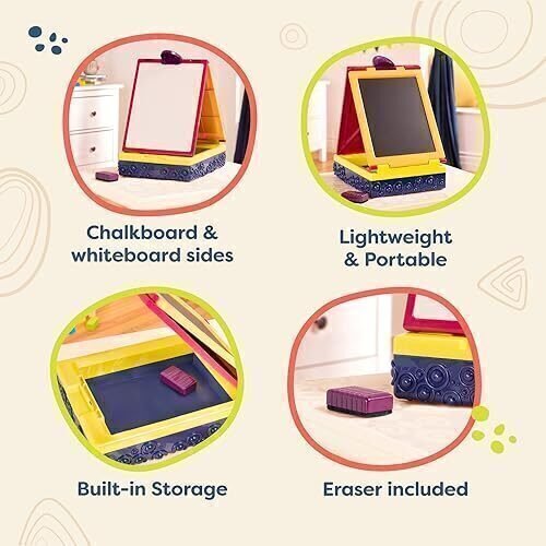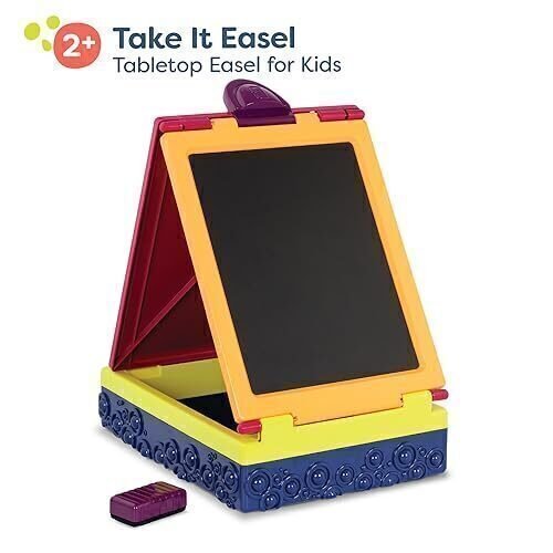 Draw, imagine, and express yourself with the Take it Easel drawing board from B. toys! This table easel comes with an eraser and has a whiteboard on one side and a blackboard on the other, so little artists can spend hours creating countless masterpieces. This toddler easel also doubles as a convenient storage box in case your child wants to take their gallery on-the-go. And a handy handle makes this portable easel easy to transport! Not to mention, drawing or writing with the Take It Easel sparks the imagination and improves fine motor skills. Recommended for budding artists 2 years old and over.