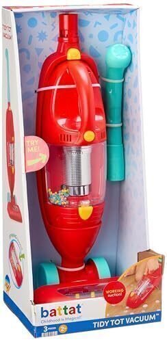 Battat 2-in-1 Vacuum Cleaner Toy features an upright vacuum as well as a detachable, handheld vacuum with colorful beads that swirl while you clean. Just press the front button to get started and away you go. All batteries included. Spark your kiddo?s imagination and get active with this playful cleaning toy. The Tidy Tot vacuum picks up lightweight bits and pieces, which can be disposed of easily by opening the dust chamber. Kids? cleaning toys are great for learning about responsibility, boosting confidence and developing gross motor skills. Recommended for kids 2 years and up.