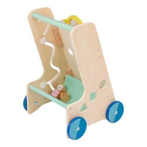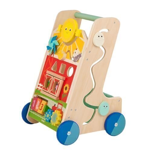 This delightful wooden activity walker combines learning and mobility in one engaging package. Designed for little ones aged 12 months and up, it features multiple interactive panels filled with exciting activities. The farm-themed design includes a cheerful sun with a spinning pinwheel, sliding barn doors, and a variety of manipulative elements. The educational features include number blocks, shape sorting activities, and colourful spinning gears that help develop fine motor skills and cognitive abilities. Crafted from quality wood with smooth edges and non-toxic finishes, this walker provides stable support with its smooth-rolling blue wheels and ergonomically positioned handle. The thoughtfully designed frame measures 25 cm in width and height, making it perfectly sized for indoor use while remaining lightweight enough for toddlers to manoeuvre. Multiple activity zones encourage exploration and learning through play, from number recognition to shape sorting. This versatile piece serves both as a mobility aid and an engaging activity centre, supporting various developmental stages as your child grows. The natural wood construction offers lasting durability, while vibrant colours and farm-themed illustrations keep young minds engaged and entertained.
