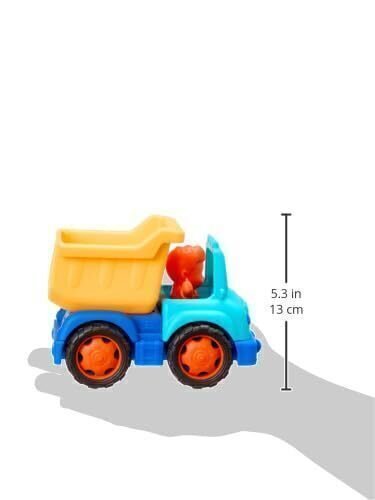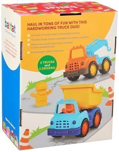 Battat Tough Truckles Construction Set includes a colorful dump truck and a tow truck, as well as 2 little drivers. Fill the dump truck, then tilt its container over to empty the contents. Kids can also move the crane truck?s arm and pretend to tow other cars. Both vehicles in this set have soft wheels that won?t scratch floors and they are perfectly sized for toddler hands. Create all kinds of imaginary scenarios, roll around the playroom and keep kids busy with this versatile pair of toy trucks. Playing with Tough Truckles promotes creativity and active play while helping to develop language and fine motor skills. This set of toy trucks for toddlers is recommended for kids 12 months and up.