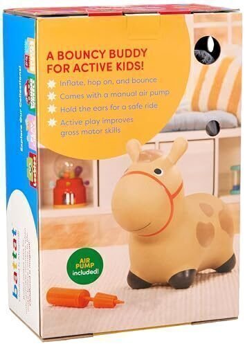 Battat Horse Bouncer sure to cause non-stop giggles, this bouncy toy for kids is soft, squishy and perfectly sized for young riders. It?s also very easy to set up. Simply use the included manual air pump to inflate the pony in minutes. Then, little ones can saddle up for some fun. With its easy-to-grab ears and sturdy build, kids can play with this bouncy horse for hours. The Hoppin? Pony is not only great for active play it also sparks creativity. Anywhere their imaginations take them. Just make sure to clear the area of other toys and obstacles before riding off into the sunset. This bounce toy is recommended for kids 18 months and up.