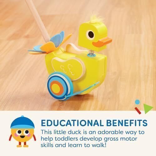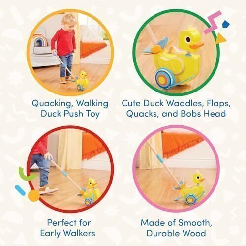 Say hello to the Quack & Go Duck, a whacky waddling push toy from Battat! Grab the wooden push pole and start walking to get it waddlin? and flappin? away! The Quack & Go Duck is made of durable wood and slaps its duck feet as children push it. The duck also has a bobblehead and makes silly quacking sounds as it waddles, encouraging toddlers to walk and walk and walk some more! They?ll practice their gross motor skills and coordination as they quack and waddle around! Quick and easy to assemble, this push toy offers kids hours of imaginative activity. Made of worry-free and durable materials, all Battat products meet or exceed EU, U. S. and Canadian safety standards. Batteries included.
