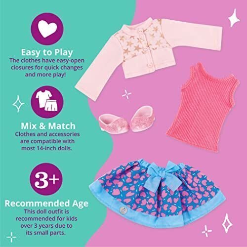 4-Piece Clothing Set: Shine bright with this four-piece fashion set for 14-inch dolls! Includes: A tank top, a cardigan, heart-printed skirt and a glittery pair of shoes. Collect Them All: Mix and match the pieces with other sets for even more looks! Pretend Play: This doll outfit set provides hours of dress-up pretend play fun! Age Recommendation: This doll accessory set is recommended for kids 3 years +.