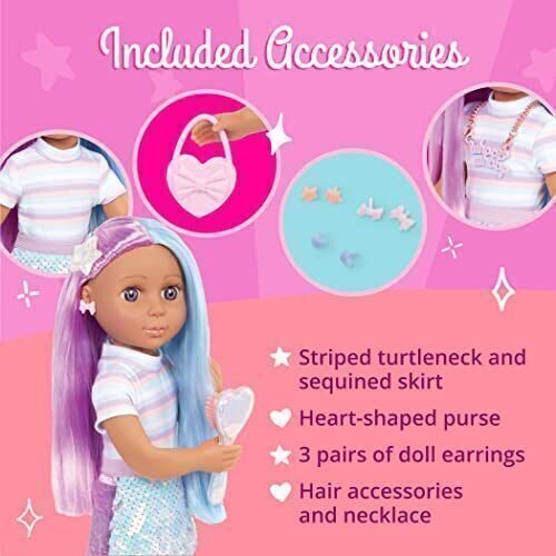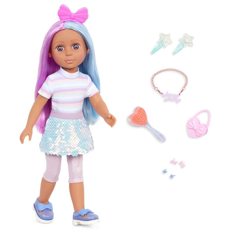 Razzle and dazzle with Ciara, the 14-inch fashion doll from Glitter Girls! She has purple eyes, soft eyelashes, and long, shiny hair that is both pink and blue! Comb her hair with her heart-shaped brush, then use her starry hair clips for fun hairstyling that wows the crowd. Try braiding or twisting her hair together for a fabulous swirl of colors! Then, add the pink headband for more flair. What?s even more awesome is that Ciara has pierced ears! She comes with 3 pairs of earrings that you can mix and match for glamorous style. Choose between the peachy stars, pink bows, or blue hearts! Ciara also sports a charmed necklace that doubles as a kid?s bracelet! From her cute jewelry to her pastel outfit and hair accessories, Ciara makes a fabulous addition to any toy collection.