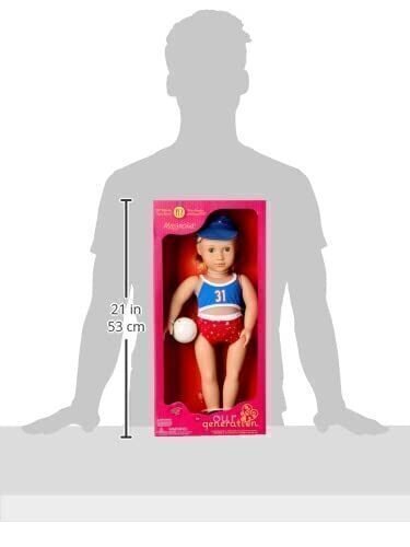 18-inch volleyball player doll from the Our Generation Athletic Team Series Long red hair, bright green eyes that open and close, and adorable freckles Cuddly soft body with plastic arms and legs that rotate to move like a real volleyball player Includes: doll, volleyball outfit, visor, ball, and sandals Complete the Athletic Team Series collection with Imene, Sun, and Nya (sold separately) Compatible with most 18-inch dolls, outfits, and accessories Suggested for ages 3+ (small parts) No batteries required