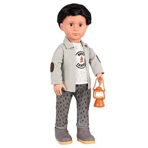 18-inch boy doll camping outfit Press the button to light-up the lantern on hikes and tell fun campfire stories Includes: jacket, sleeveless top, pants, lantern, and hiking boots Compatible with most 18-inch dolls and accessories Suggested for ages 3+ (small parts) Requires 2 x AG13 batteries (included) Dolls sold separately
