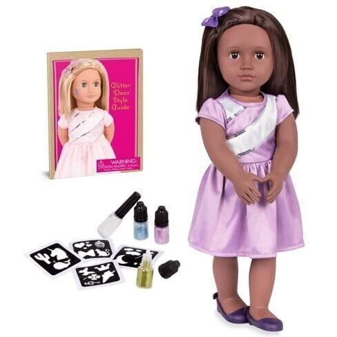 18-inch glitter tattoo deco doll with straight shoulder-length brown hair and brown eyes Includes dress, shoes, stencils, glitter glue kit, and style guide Compatible with most 18in dolls including American Girl Suggested for Age 3+ (small parts) No batteries required