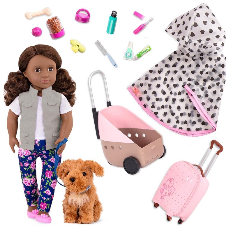 Our Generation Malia & Passenger Pets Bundle 18 inches Fashion Doll & Pet Travel Set Doll 18 inches 1 Dog 14 Accessories