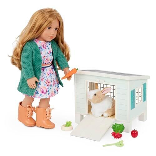 There’s no place like a hoppy home! The Our Generation Bunny Hutch playset for 18-inch dolls is the perfect pet house for every critter lover and animal fan. Plus, it even comes with a plush bunny to care for! Designed to replicate a real-life rabbit house, it features trendy colors, lookout windows on every side, and a door that opens and closes for kids to play out fun adventures. Plus, it also includes play food accessories like a food bowl, a lettuce leaf, a carrot, a stalk of celery, an apple, and a bundle of radishes, giving kids everything they need to feed their furry friend! This Our Generation Bunny Hutch playset makes a great gift for ages 3+ (small parts), teaching animal care and responsibility for kids looking to own a real pet. Compatible with most 18-inch dolls and accessories. Our Generation dolls sold separately.