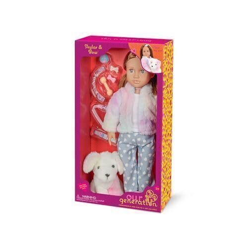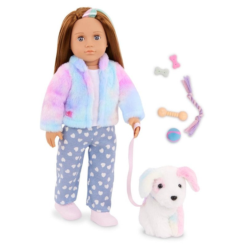 Introducing the delightful Skylar & Bow 18-inch Doll & Pet Plush Puppy Set – a charming companion for young dreamers. – This adorable doll, with her warm brown hair and expressive blue eyes – is dressed in a cosy pastel-hued outfit ? a fuzzy faux fur jacket in shades of pink and blue – a white top, and heart-printed pyjama bottoms. Her ensemble is complete with pink slippers – adding a touch of whimsy. – But the fun doesn’t stop there! – This set also includes a lovable plush puppy, ready to be Skylar’s loyal furry friend. Together, – they’ll embark on countless imaginative adventures. – The doll comes with additional accessories like a brush – hair ties – and a ball – encouraging creativity and nurturing playtime. – With its high-quality construction and attention to detail – this set promises countless hours of joy and cherished memories. – Embrace the magic of childhood with the Skylar & Bow 18-inch Doll & Pet Plush Puppy Set.